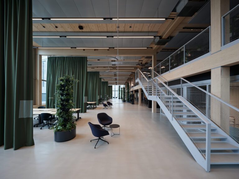 Dank der hohen Festigkeit konnten große Spannweiten, schlanke Querschnitte und reduzierte Konstruktionshöhen realisiert werden – selbst bei stark belasteten Erdgeschossstützen. Zwei massive Erschließungskerne übernehmen die Aussteifung, während das Stützen-Unterzug-System flexible Bürostrukturen ermöglicht. Das Projekt zeigt eindrucksvoll, wie BauBuche auch im mehrgeschossigen Holzbau wirtschaftliche, brandschutztechnisch sichere und dauerhaft flexible Tragwerkslösungen ermöglicht.