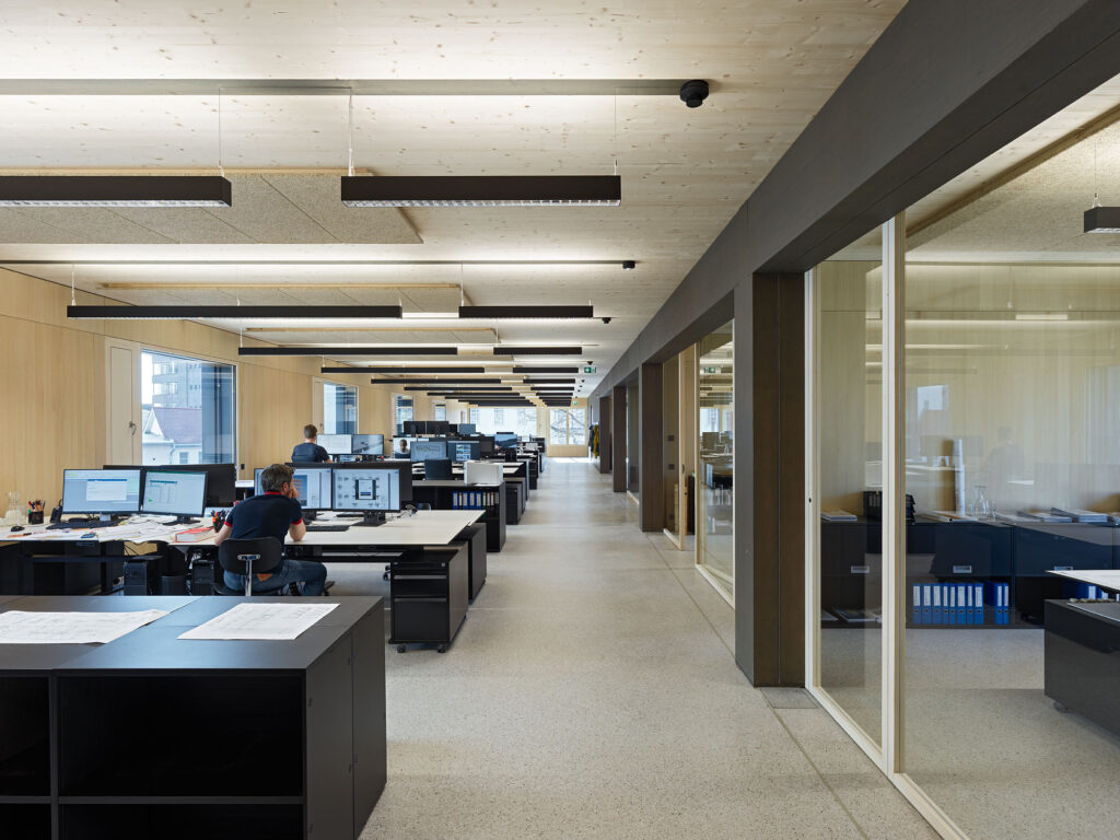 In Dornbirn (Vorarlberg) entstand mit dem Bürogebäude „Sägen 6“ ein fünfgeschossiger Holzbau, entworfen von den beiden ansässigen Planungsbüros, die ihn selbst nutzen. Das Tragwerk setzt in vielen Bereichen auf BauBuche – einen leistungsstarken Laubholzwerkstoff mit hoher Tragfähigkeit und ansprechender Optik. Der zentrale Versorgungsschacht aus Brettsperrholz (CLT) übernimmt statische Funktionen. Die Konstruktion folgt einem Holzskelettprinzip, das Lasten direkt von Stütze zu Stütze leitet und so Material effizient nutzt. Architektonisch überzeugt „Sägen 6“ durch ein klares Raster, sichtbare BauBuche-Stützen und eine schlichte Holzhülle aus Fichtenpaneelen.