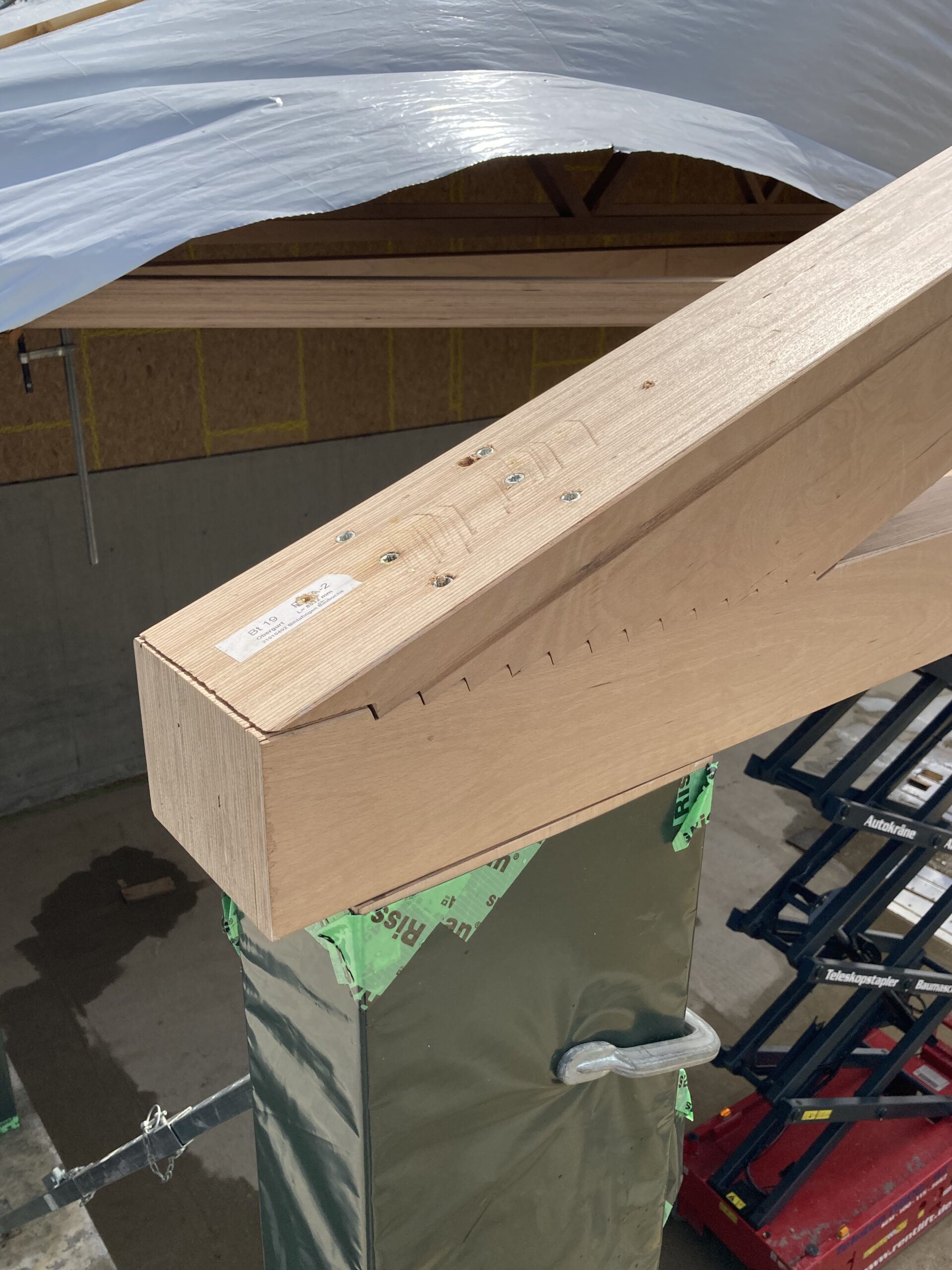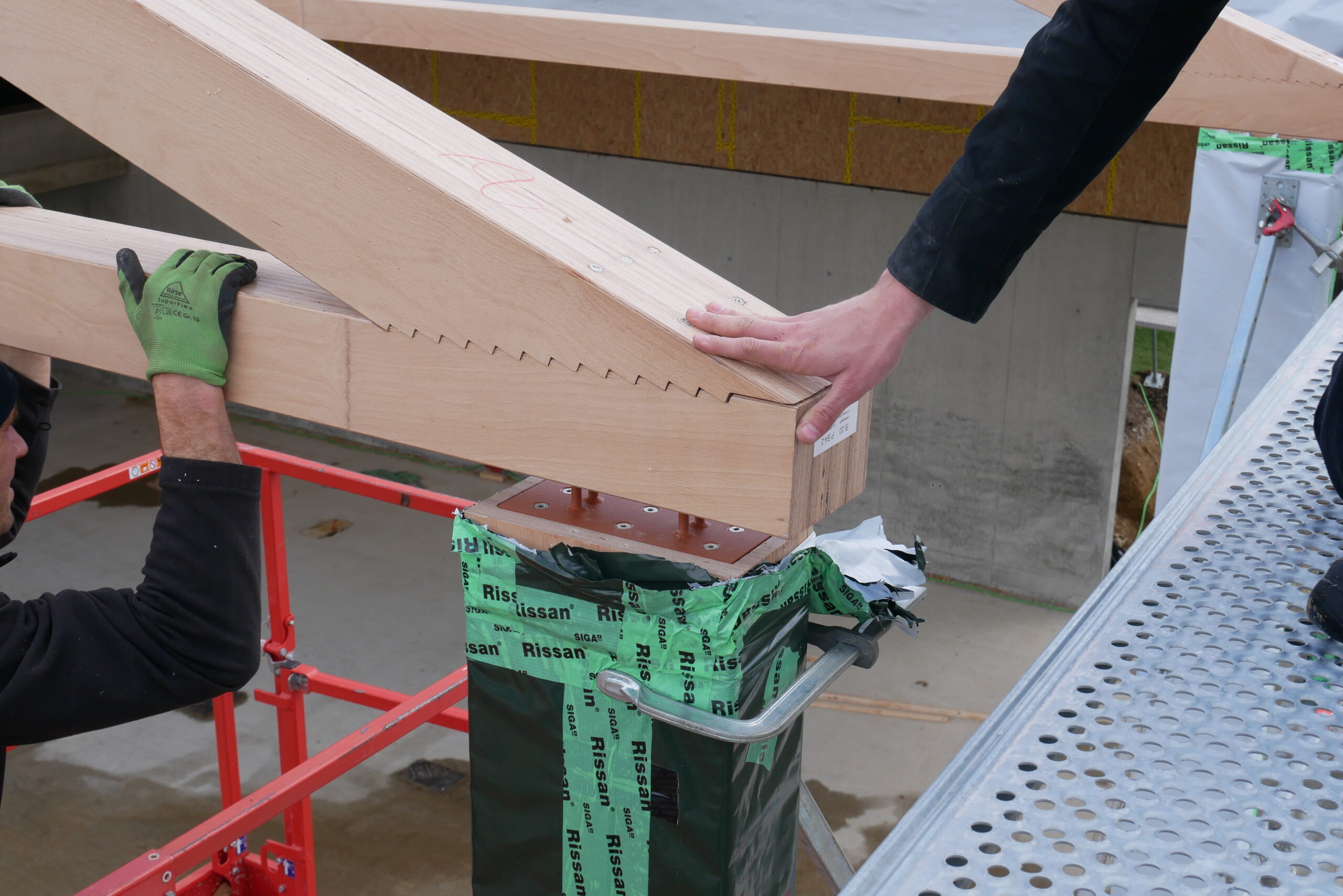 Ce type de poutre présente un atout majeur, à savoir que le système est statiquement autonome et ne doit être soutenu qu’à la verticale. Ainsi, les fermes Polonceau sont simplement posées, moyennant un entraxe de 2,775 m, sur les poteaux en BauBuche de 2,65 m de haut (l x h : 16 cm x 30 cm) – qui, dans ce contexte, ont pu être conçus comme des poteaux pendulaires -, ou elles sont fixées à ces poteaux de manière réversible à l’aide de goujons à poussée moyennant une plaque en acier encastrée dans le poteau.