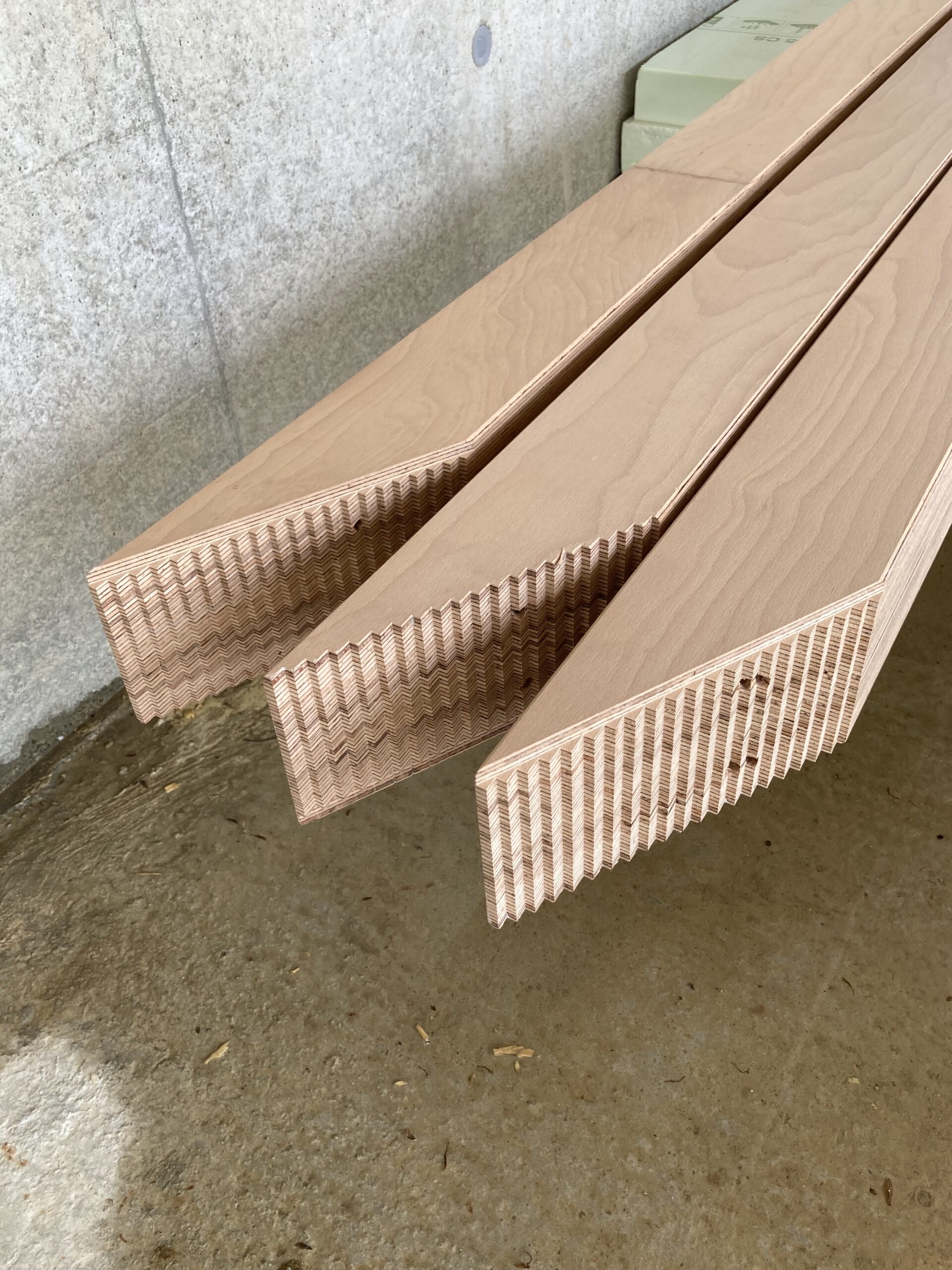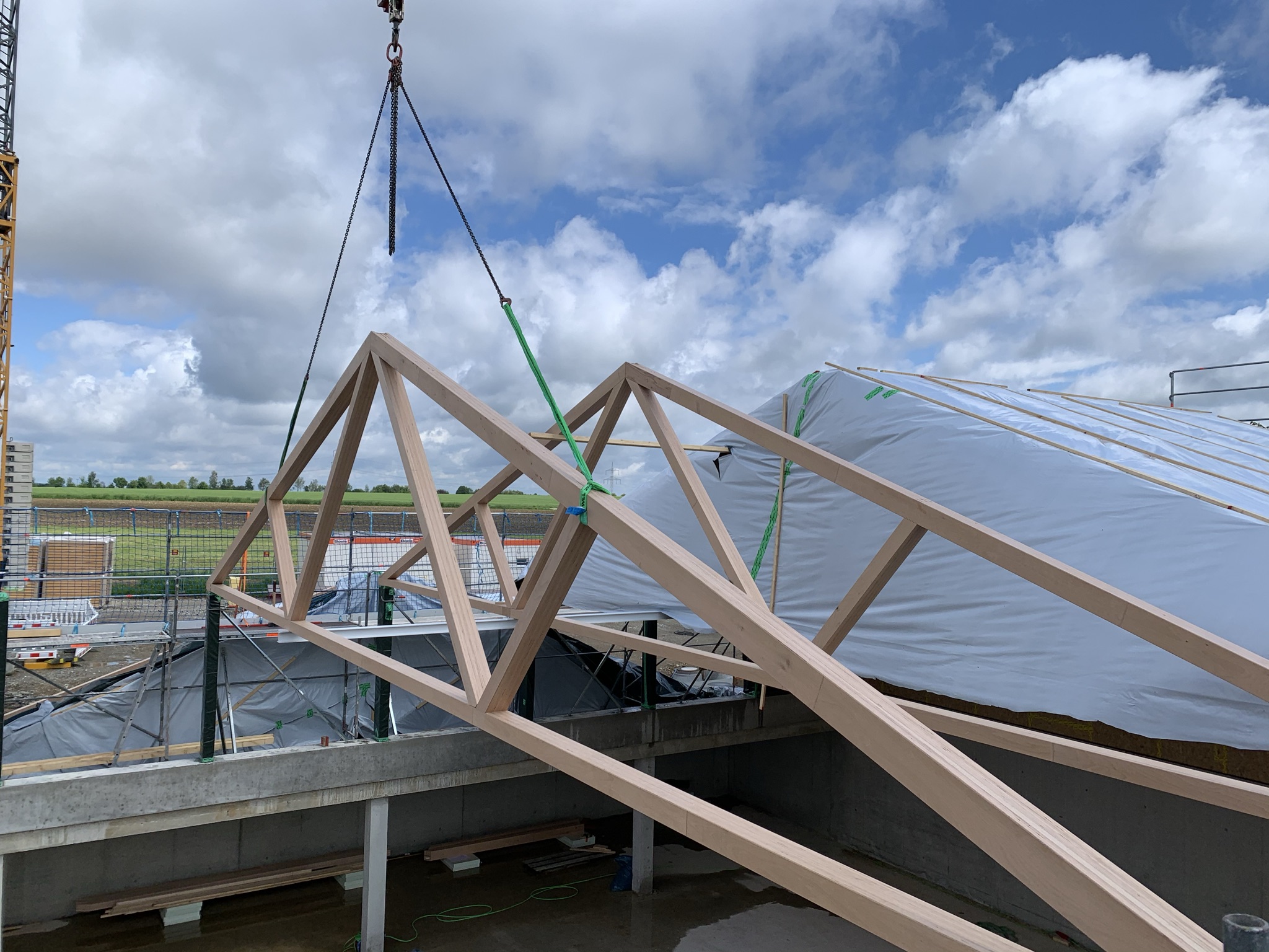 Sur les poutres en BauBuche, des éléments de construction en panneaux de bois entièrement isolés de 32,50 cm d’épaisseur sont posés dans le sens longitudinal de la halle. Ces éléments sont composés de pannes de 20 cm de hauteur, de panneaux de fibres de bois de 10 cm d’épaisseur sur la face supérieure et de panneaux OSB de 2,5 cm d’épaisseur sur la face inférieure. Le revêtement OSB de la face inférieure est cloué aux chevrons en BauBuche des fermes Polonceau, ce qui forme un assemblage résistant au cisaillement. Les moitiés de toit ainsi formées en dalles de toiture ont en outre été reliées (comment ?) aux pignons de manière à être résistantes au cisaillement et elles assurent le renforcement transversal du bâtiment. Dans le sens longitudinal, la construction en bois est renforcée par deux diagonales de compression, également en BauBuche, qui forment une « structure en treillis ». Elles servent de tension comme une charpente horizontale entre deux extrémités de poutres distantes de 5,55 m au niveau de la ceinture inférieure, en diagonale par rapport au premier point de jonction de la ferme Polonceau située entre les deux. Les poutrelles de compression horizontales nécessaires à cet effet le long des avant-toits sont intégrées au niveau des panneaux de bois de la toiture.