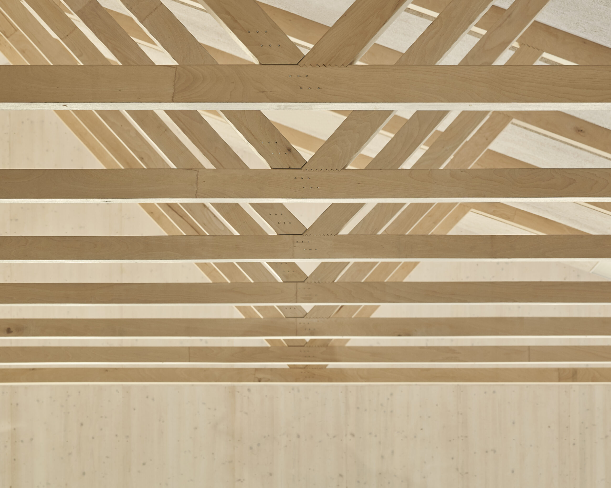 Dans l’espace intérieur de la halle, la logique de construction est rendue visible par un choix de matériaux discret et précisément coordonné. La solive en béton armé marque la transition entre la construction massive et la construction en bois dans la partie supérieure.
