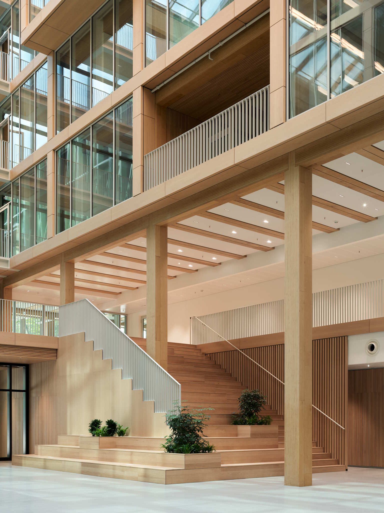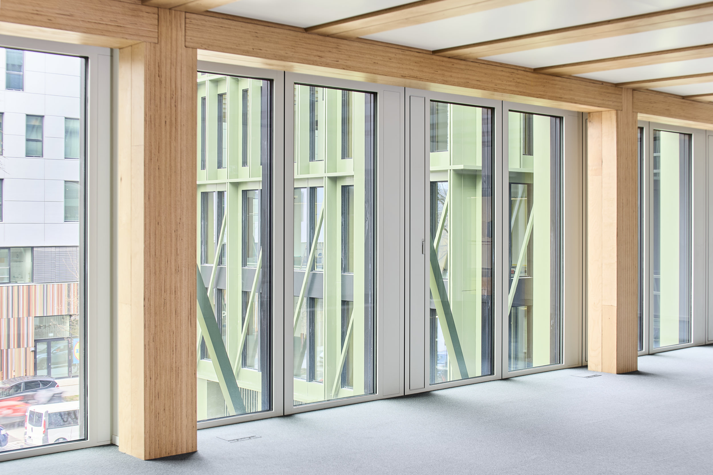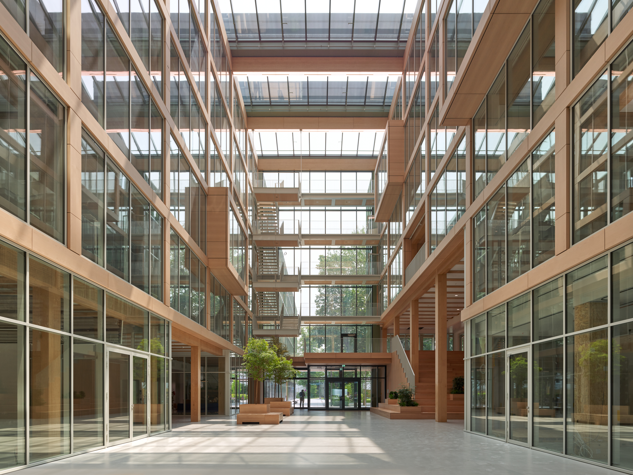 La largeur intérieure séparant ces deux ailes de 19 m de large environ est de 11 m. Avec le bloc transversal de 12 m de large, les ailes entourent, selon la longueur de l’aile courte, l’espace intérieur en U qui sert d’atrium. Chaque aile du bâtiment est accessible, côté longitudinal, par un bloc transversal central en béton armé qui abrite les escaliers et les ascenseurs mais aussi des sanitaires et d’autres salons et salles de réunion. Des couloirs mènent aux bureaux disposés des deux côtés, dont il est possible de diviser les surfaces de manière flexible, de sorte que chaque étage peut être divisé en un à six espaces locatifs. À l’intérieur des étages, les zones peuvent être agencées en bureaux individuels et collectifs, ou en espaces de communication. La structure à ossature en bois composée de poteaux et de poutres en BauBuche très porteurs a permis de créer la structure de bureaux ouverte souhaitée sur la base d’une trame de construction de 5,40 m dans le sens transversal du bâtiment et le sens longitudinal des bureaux.