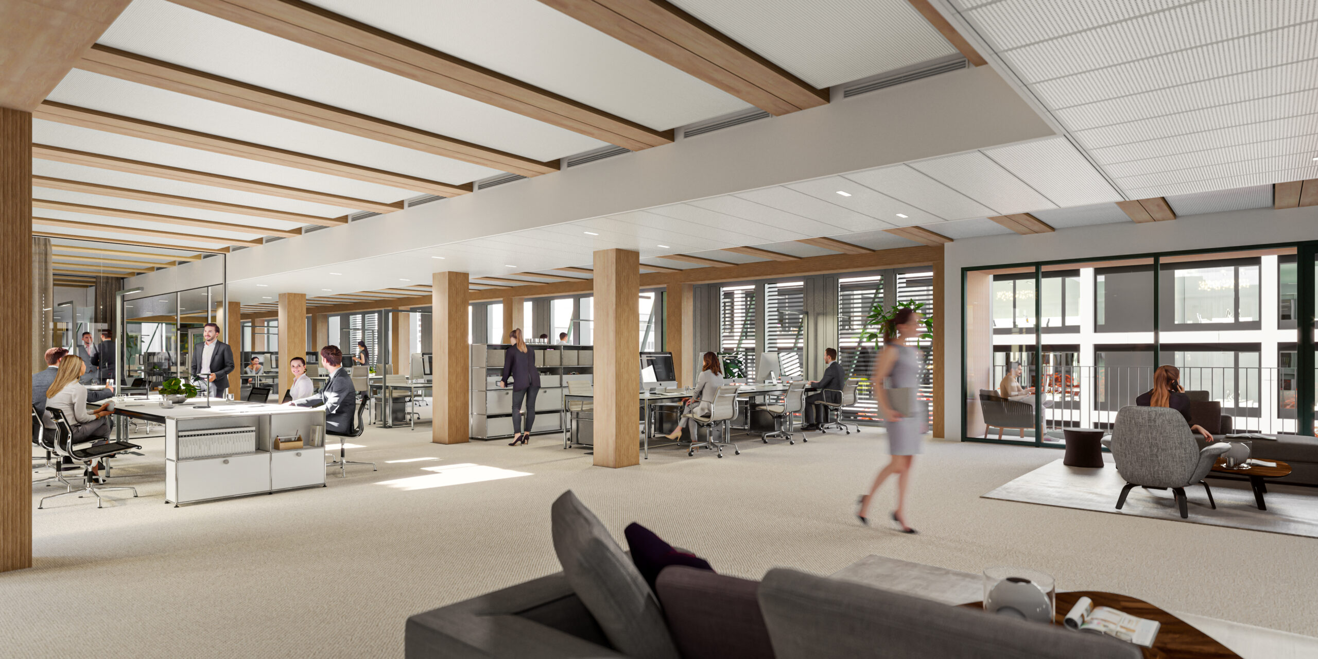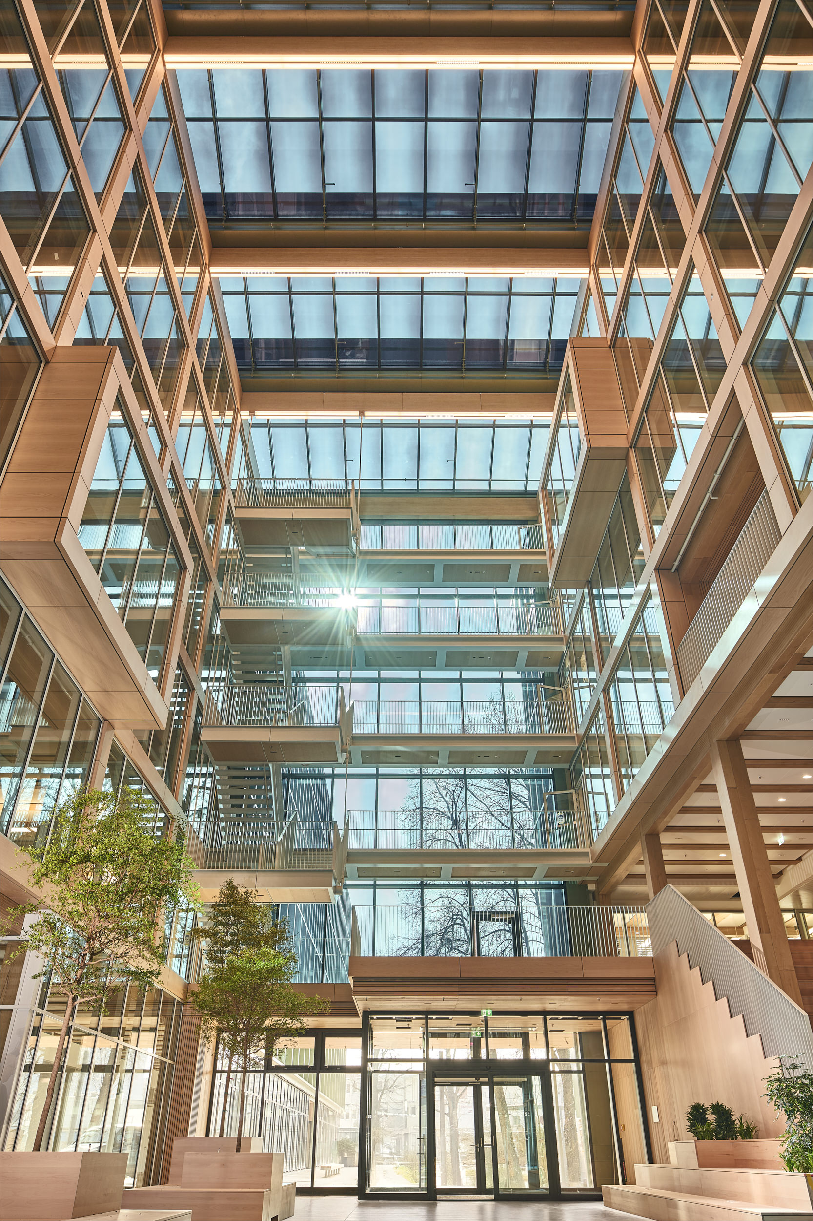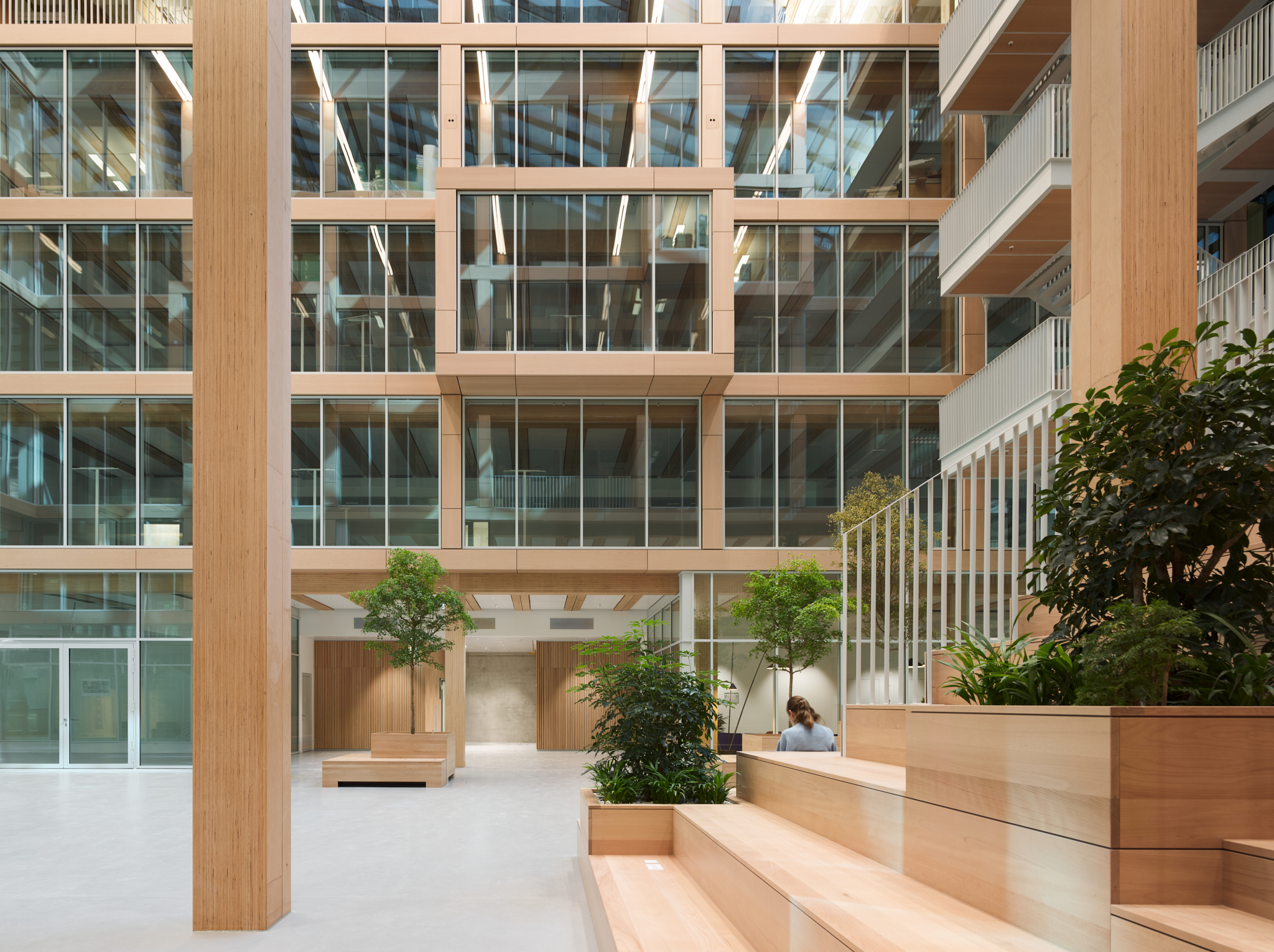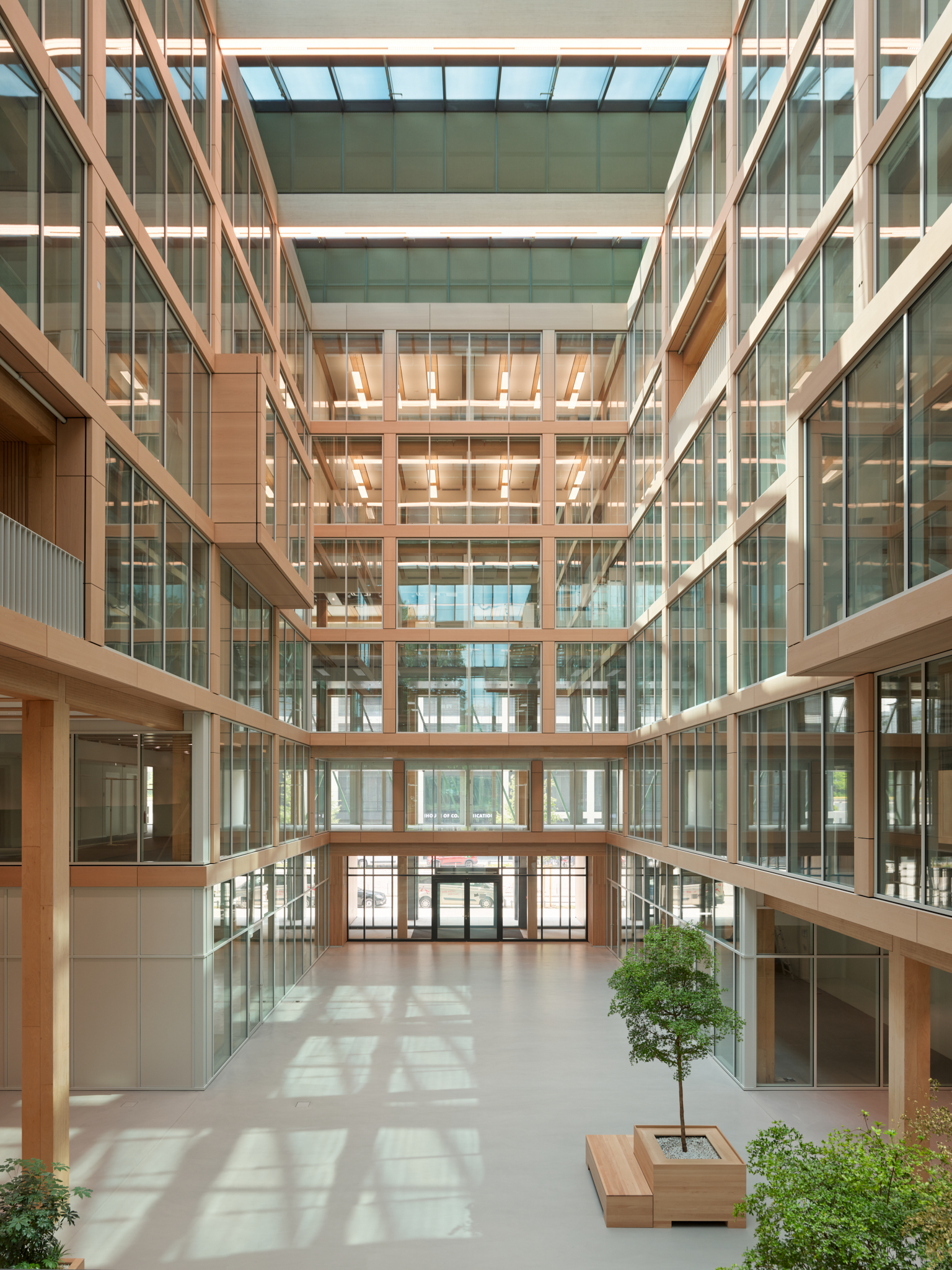 La largeur intérieure séparant ces deux ailes de 19 m de large environ est de 11 m. Avec le bloc transversal de 12 m de large, les ailes entourent, selon la longueur de l’aile courte, l’espace intérieur en U qui sert d’atrium. Chaque aile du bâtiment est accessible, côté longitudinal, par un bloc transversal central en béton armé qui abrite les escaliers et les ascenseurs mais aussi des sanitaires et d’autres salons et salles de réunion. Des couloirs mènent aux bureaux disposés des deux côtés, dont il est possible de diviser les surfaces de manière flexible, de sorte que chaque étage peut être divisé en un à six espaces locatifs. À l’intérieur des étages, les zones peuvent être agencées en bureaux individuels et collectifs, ou en espaces de communication. La structure à ossature en bois composée de poteaux et de poutres en BauBuche très porteurs a permis de créer la structure de bureaux ouverte souhaitée sur la base d’une trame de construction de 5,40 m dans le sens transversal du bâtiment et le sens longitudinal des bureaux.