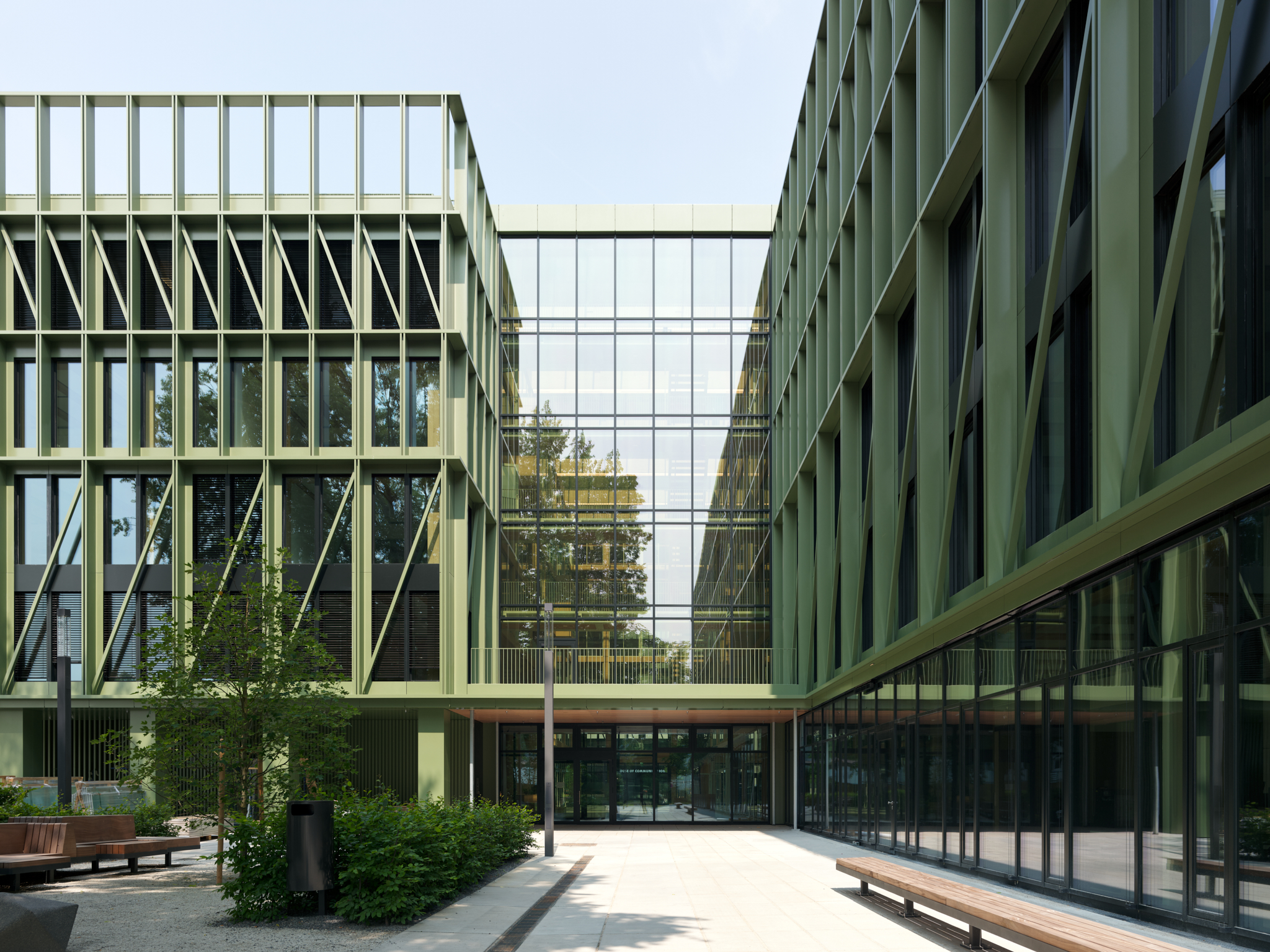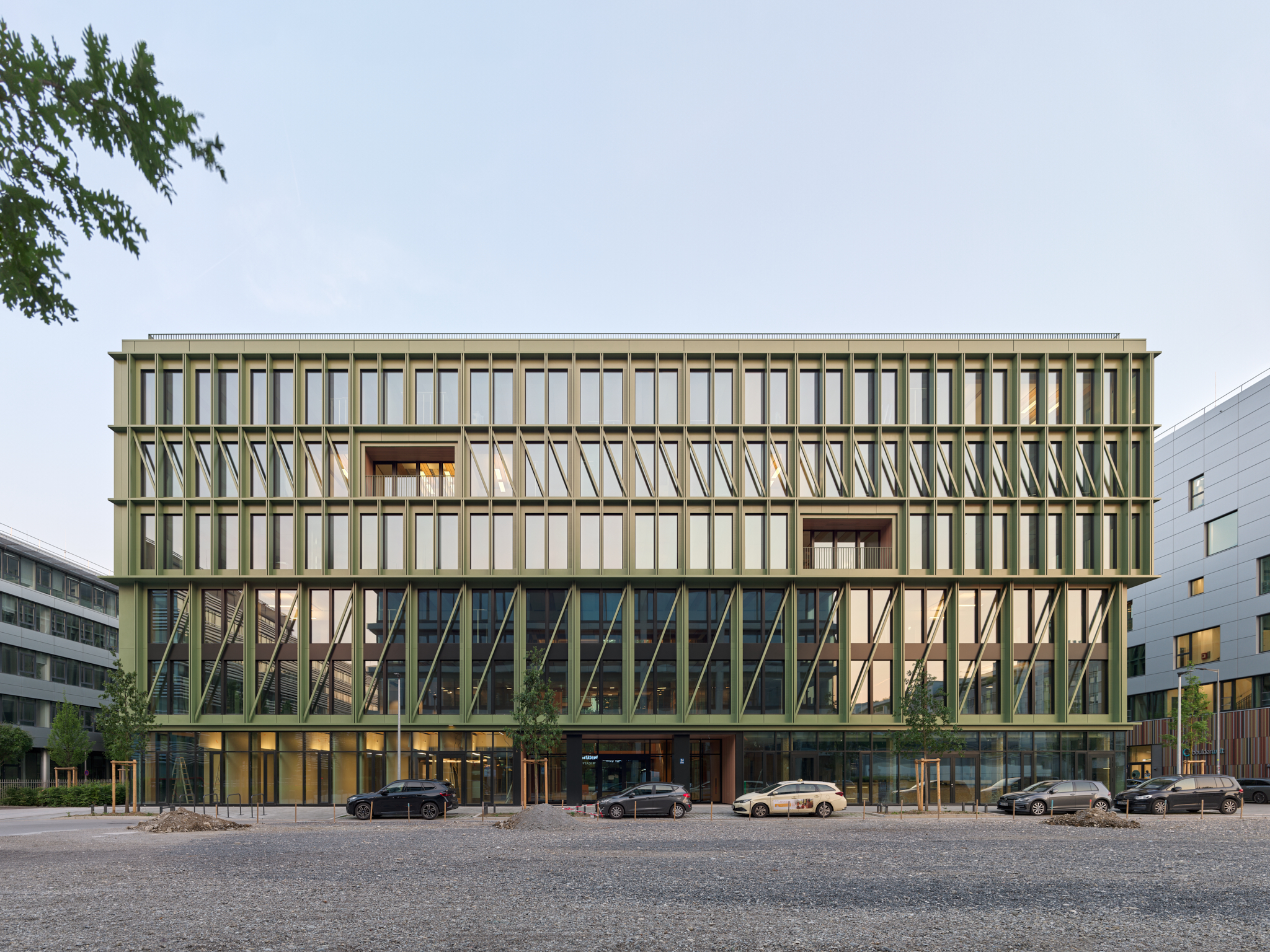 Si, à l’intérieur, le bois et le verre dominent l’architecture, l’extérieur du bâtiment présente une façade remarquable composée d’éléments en aluminium vert. L’idée est de créer un lien avec l’ancien site ferroviaire et industriel. La teinte choisie est le vert DB601, la couleur de peinture utilisée aujourd’hui encore par la Deutsche Bahn sur certains éléments tels que les mâts, les ponts et les barrières. L’aluminium est composé à 75 % d’aluminium recyclé en fin de cycle de vie, dont la production ne nécessite qu’une fraction de l’énergie nécessaire à la production d’aluminium primaire.