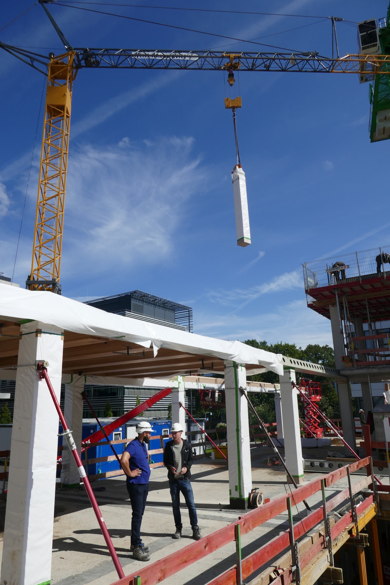 Un dernier point très intéressant : le gain de surface réalisé dans un immeuble de bureaux de cette taille grâce à l’utilisation du BauBuche est remarquable. En effet, ce bois dur très porteur permet des poteaux très fins malgré des charges élevées. Au total, dans le bâtiment i8, si l’on compare avec des poteaux en bois lamellé-collé d’épicéa, le BauBuche permet de gagner 64 m². En fonction du prix du mètre carré de bureaux, cela peut parfois représenter une plus-value considérable, qui peut atteindre des centaines de milliers d’euros pour un immeuble de la taille du i8 – un montant qui devrait interpeller tout promoteur et investisseur. Et on ne peut par ailleurs ignorer l’avantage esthétique d’une construction bois en BauBuche, l’esthétique qui est naturellement une priorité lors de la conception et de la planification.