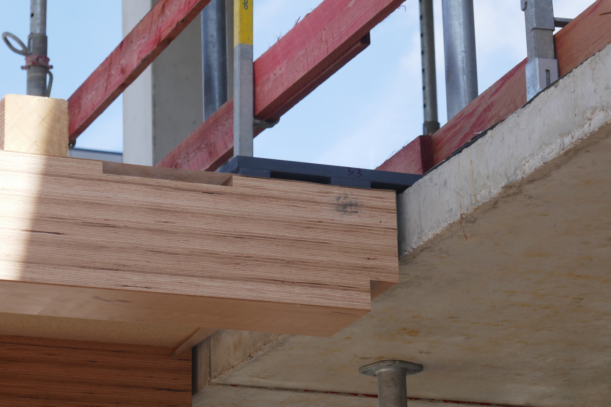 Le point de raccordement de la poutre Deltabeam de 33,5 cm de hauteur est tout à fait différent, avec une plaque en porte-à-faux soudée à l’extrémité avant de la poutre entre les poteaux en BauBuche, pour ne citer qu’un exemple. Au niveau de l’appui des éléments mixtes bois-béton sur le noyau massif, les nervures en BauBuche butent contre les plafonds en béton armé avec un joint étroit. Ces nervures sont entaillées afin que la couche de béton des éléments mixtes bois-béton, renforcée par des éléments en acier, puisse reposer dessus.
