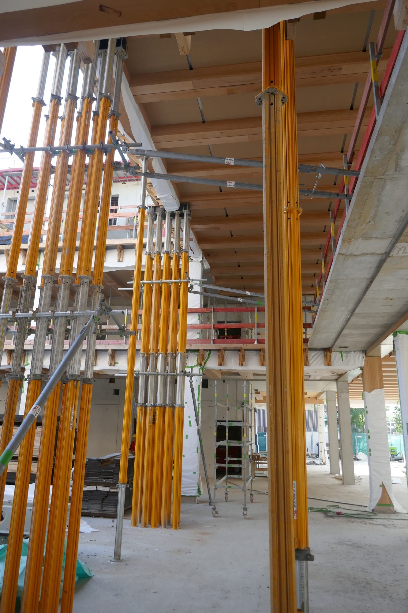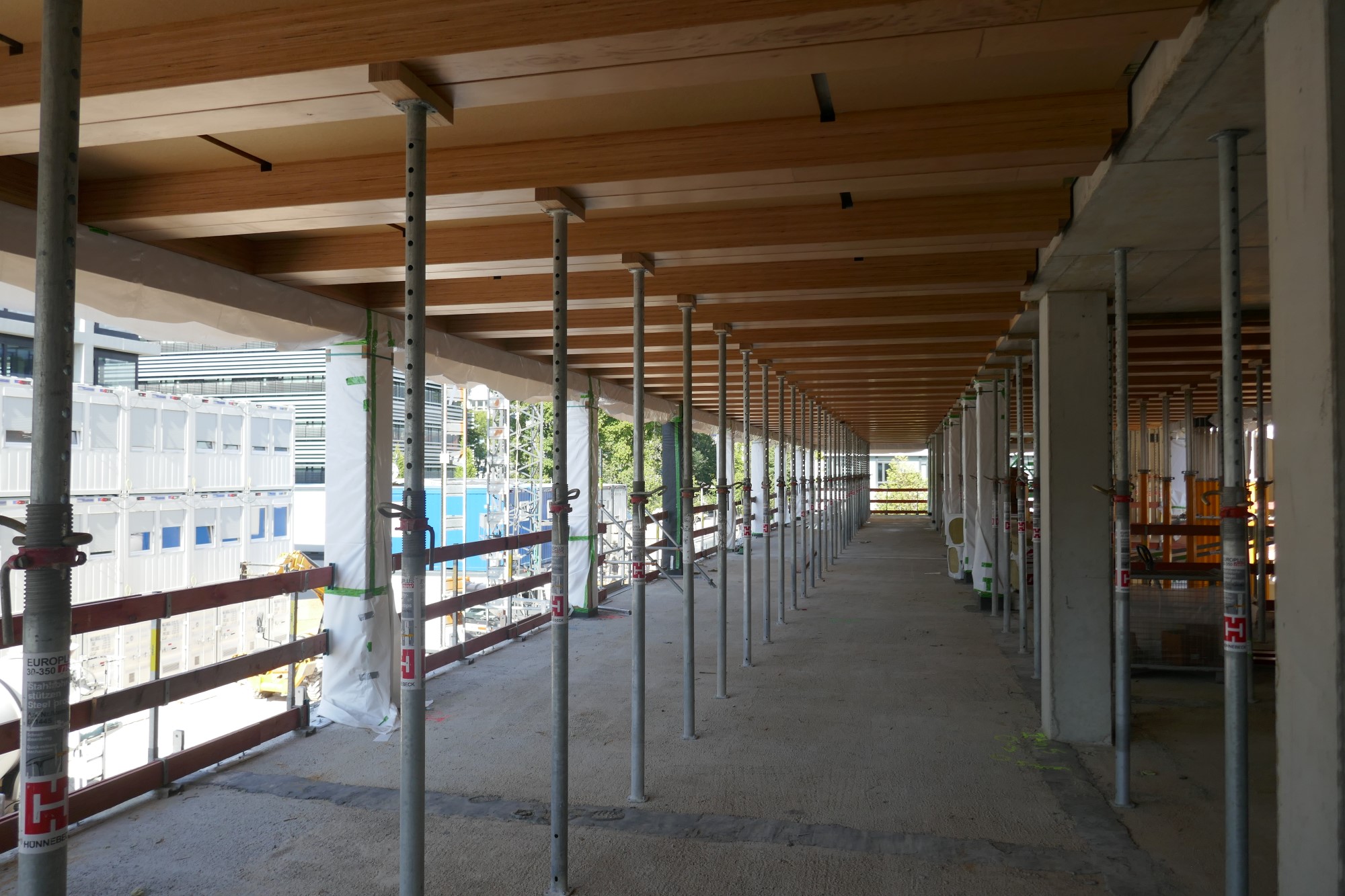 Les plafonds sont réalisés avec des éléments composites bois-béton sous forme de plafonds nervurés. Lors du montage, le noyau, qui est composé de plafonds en béton armé sur poteaux en béton armé et de murs en béton armé au niveau des sanitaires, a été érigé en premier. Ensuite, les poteaux en BauBuche de 36 x 40 cm et d’environ 4,50 m de haut ont été placés au rez-de-chaussée, sécurisés par des étais temporaires. Des poutres en BauBuche de 36 cm de large et 48 cm de haut ont ensuite été posées sur les supports dans les axes de façade. Entre ces poutres de façade et le noyau massif, la partie en bois des plafonds mixtes bois-béton a finalement pu être suspendue élément par élément, l’armature a été mise en place et les porte-à-faux de différentes tailles ont été préparés. Chaque élément de plafond comprend quatre poutres en BauBuche (l x h = 20 x 24 cm), une sur chaque côté longitudinal extérieur et une double poutre au centre. Les éléments sont revêtus, côté béton, de panneaux de particules (LivingBoard P7). Les baguettes dentées BauBuche maintiennent les éléments aux extrémités et assurent la stabilité nécessaire des éléments de plafond pendant le transport et le montage. Avant que la chape en béton des plafonds mixtes bois-béton puisse être coulée au rez-de-chaussée, des supports appropriés ont dû être installés sous le plafond. Le bâtiment a été construit étage par étage selon ce principe.